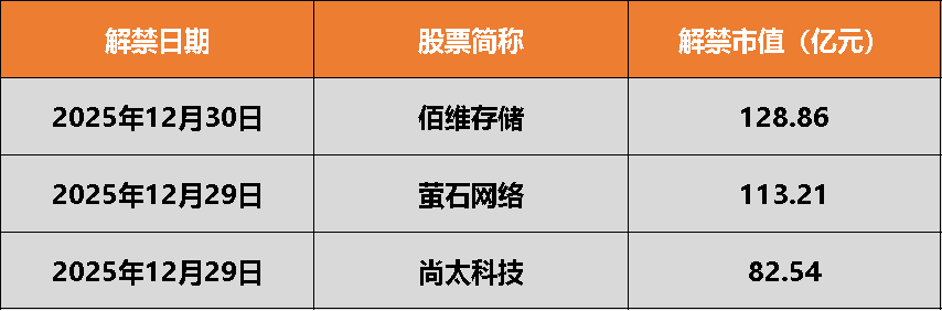 具体来看,佰维存储在12月30日将解禁近1.14亿股,萤石网络在12月29日将解禁3.78亿股,尚太科技在12月29日将解禁9532.70万股,均为首发原股东限售股份。