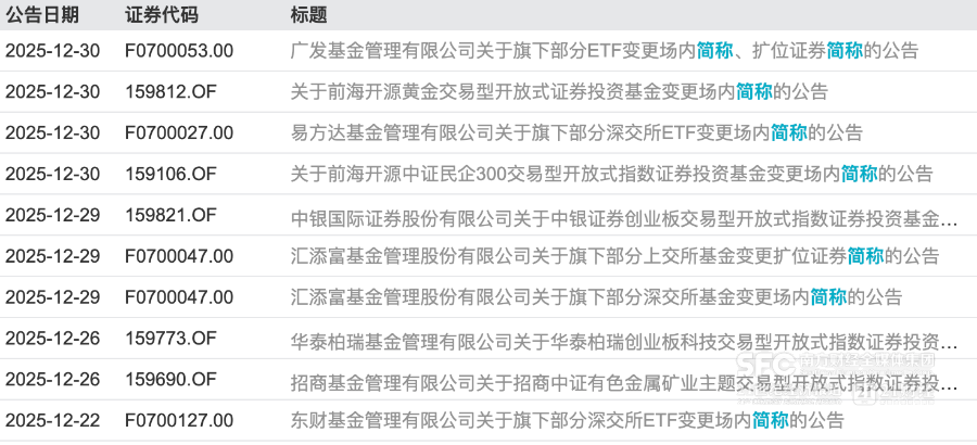 广发基金则在12月30日宣布调整19只ETF简称。