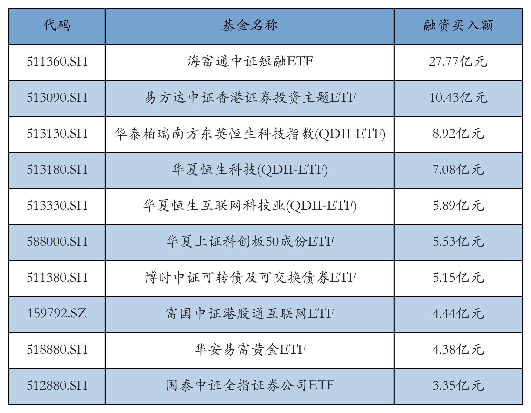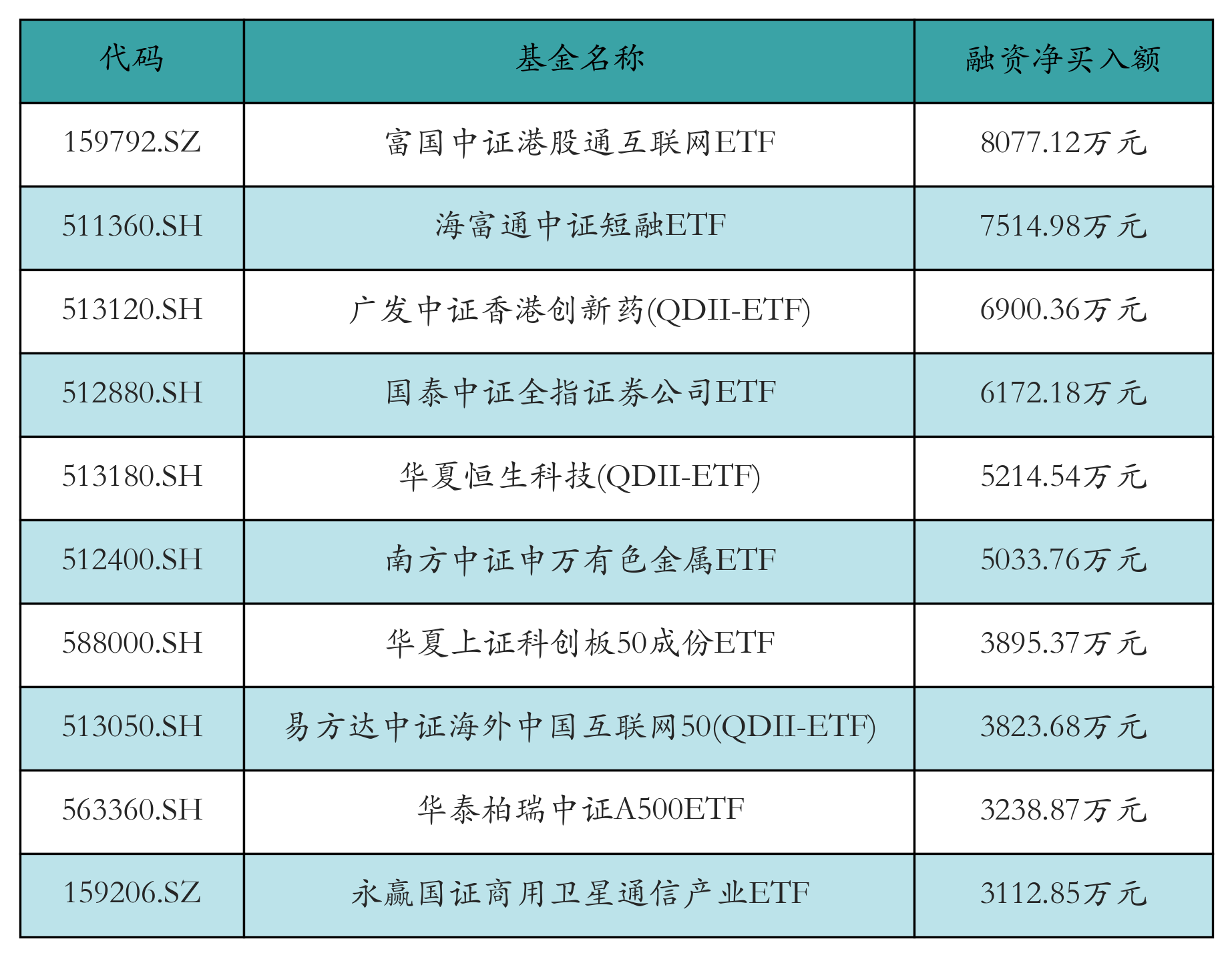 12月29日ETF融资净买入额前三位分别为:富国中证港股通互联网ETF(8077.12万元)、海富通中证短融ETF(7514.98万元)和广发中证香港创新药(QDII-ETF)(6900.36万元),前10具体见下表: