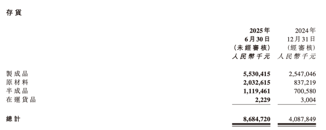 应对金价波动的风险,老铺黄金通过融资“囤金”的策略锁定库存成本。数据显示,截至2025年6月,其存货规模达86.85亿元,相比去年末增长112.45%。