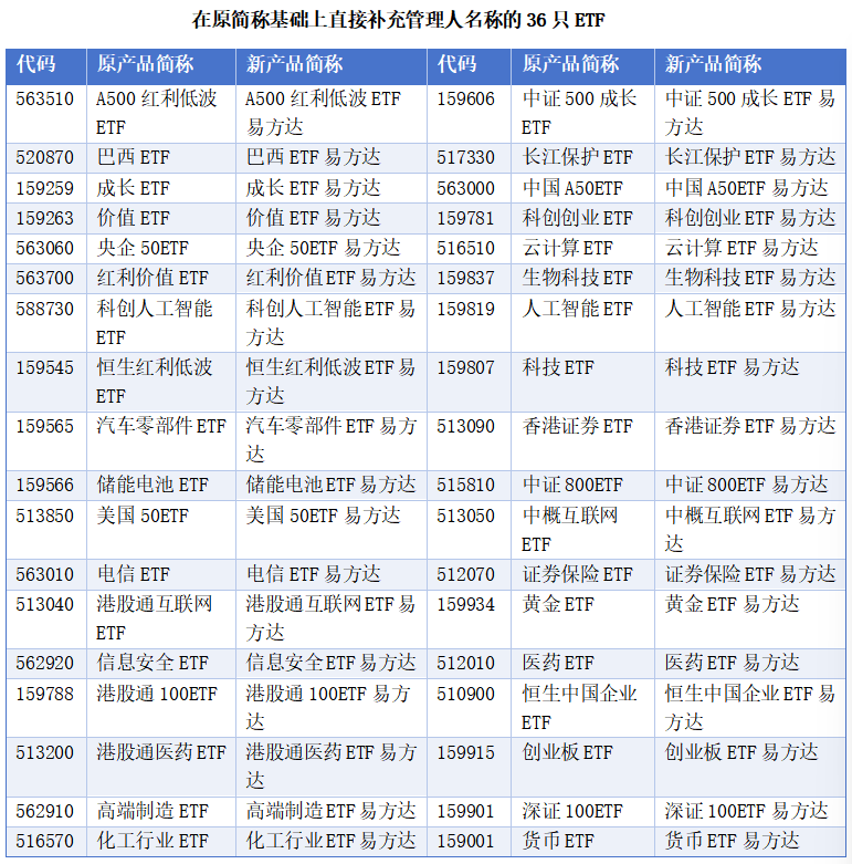 记者了解到,目前,多家基金公司已陆续启动相关调整工作,易方达基金成为业内首家完成全量ETF规范命名的机构。事实上,在交易所发布修订规则前,易方达基金已经开始着手解决ETF简称不规范问题,于2025年1月率先对17只ETF进行了批量更名,随后又在2月完成第二批8只ETF简称的调整。截至目前,该公司旗下已有A500ETF易方达(159361)、红利ETF易方达(515180)等超70只ETF统一按“标的指数+ETF+易方达”的规则命名。