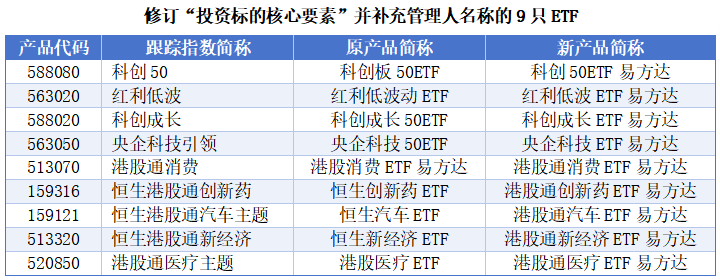 例如,对于通过港股通机制投资港股的行业主题ETF,在简称中加入“港股通”字样,如将跟踪恒生港股通创新药指数的“恒生创新药ETF”调整为“港股通创新药ETF易方达”;去掉冗余汉字或数字,如将跟踪科创50指数的“科创板50ETF”调整为“科创50ETF易方达”,将跟踪科创成长指数的“科创成长50ETF”更名为“科创成长ETF易方达”。