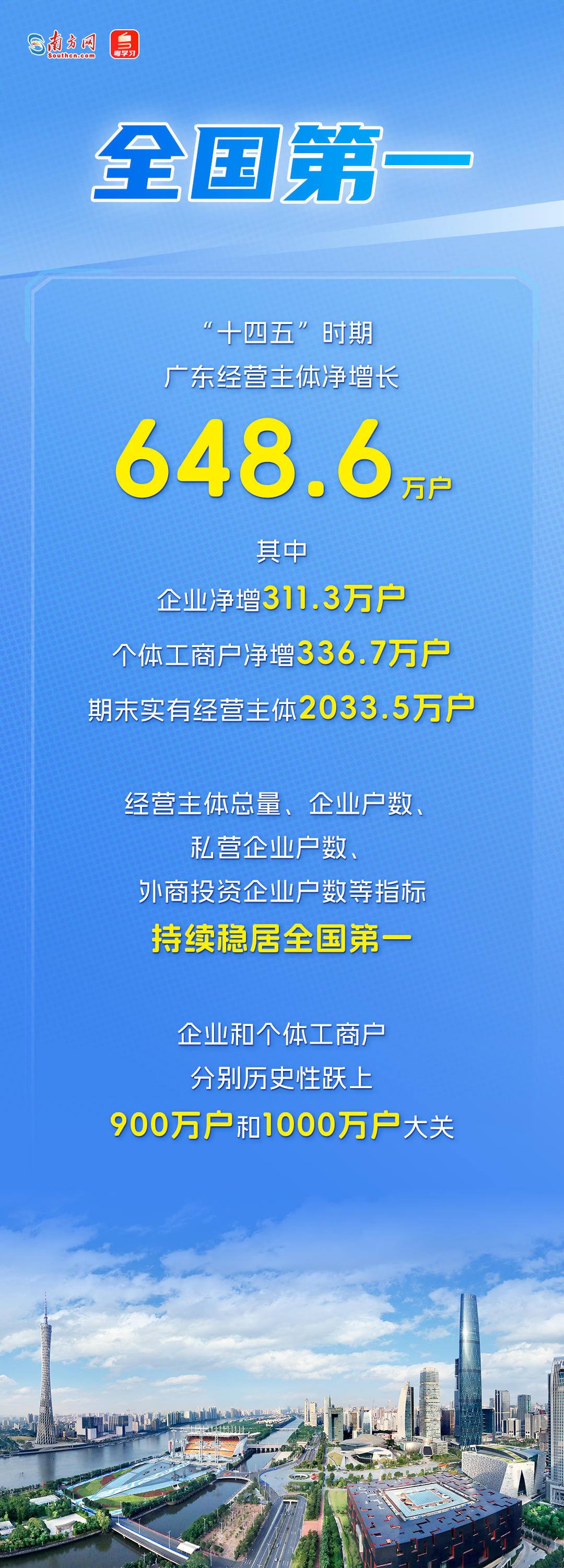 12月29日,广东省市场监督管理局召开“十四五”高质量发展成效新闻发布会,公布亮眼“成绩单”。发布会透露,“十四五”时期,广东经营主体总量、企业户数、私营企业户数、外商投资企业户数等多项指标持续位居全国第一,扎实筑牢广东经济高质量发展的微观基础。让我们通过一组海报,速览这份沉甸甸的发展硕果!