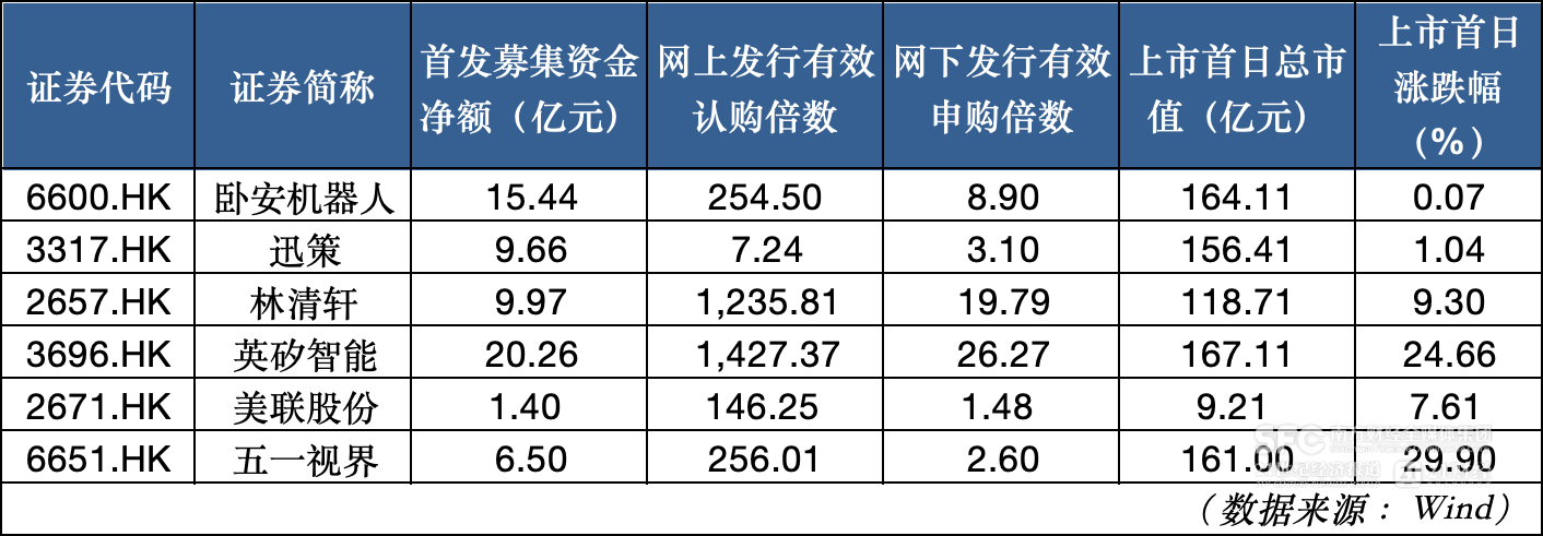 英矽智能、林清轩、迅策、卧安机器人、美联股份、五一视界(51WORLD)的公司市值分别超167亿港元、118亿港元、156亿港元、164亿港元、9亿港元、161亿港元。