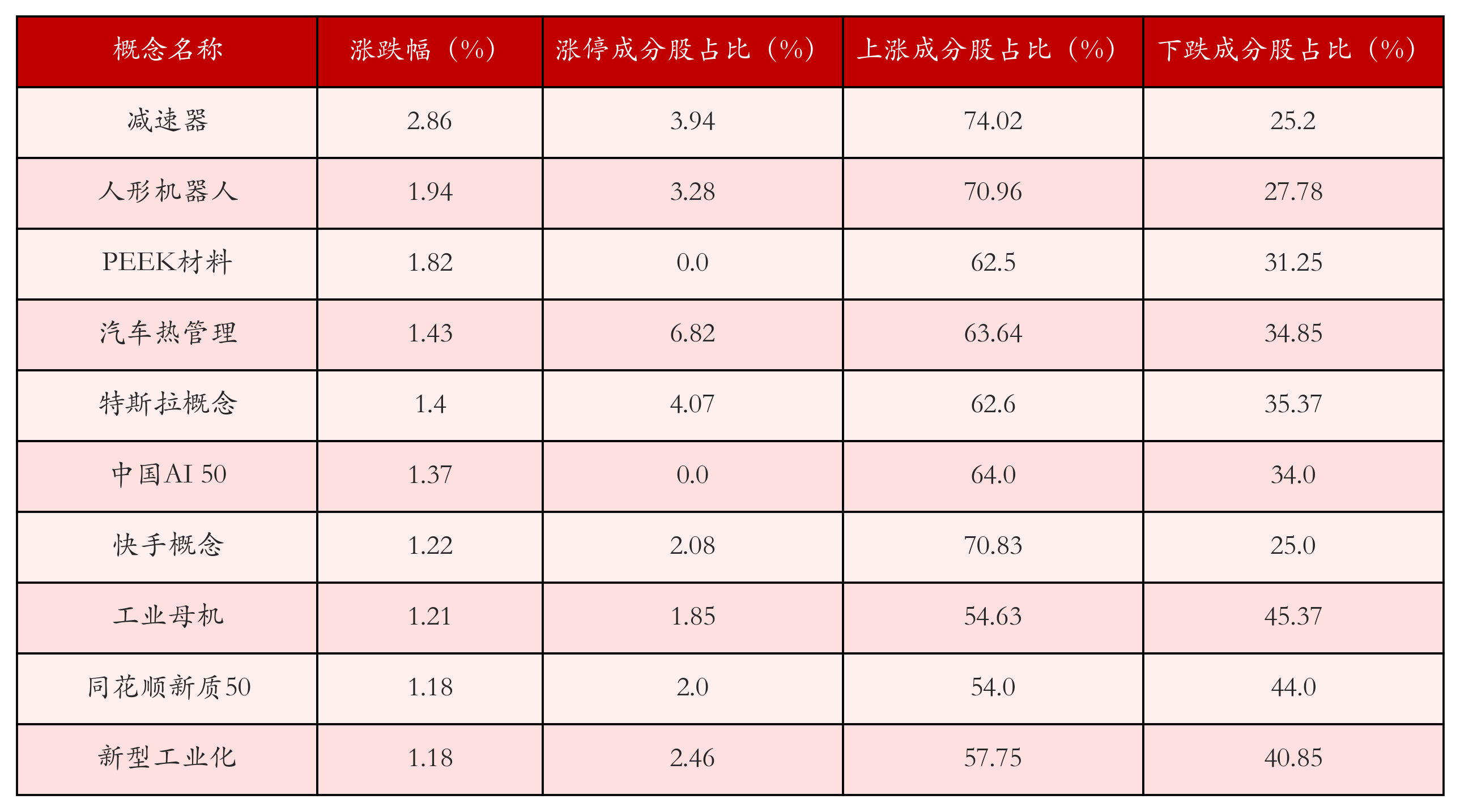 根据A股概念涨跌幅与所对应的股票池综合分析,涨幅靠前的三个概念板块分别为:减速器、人形机器人与PEEK材料。排名前10位的概念板块相关数据见下表: