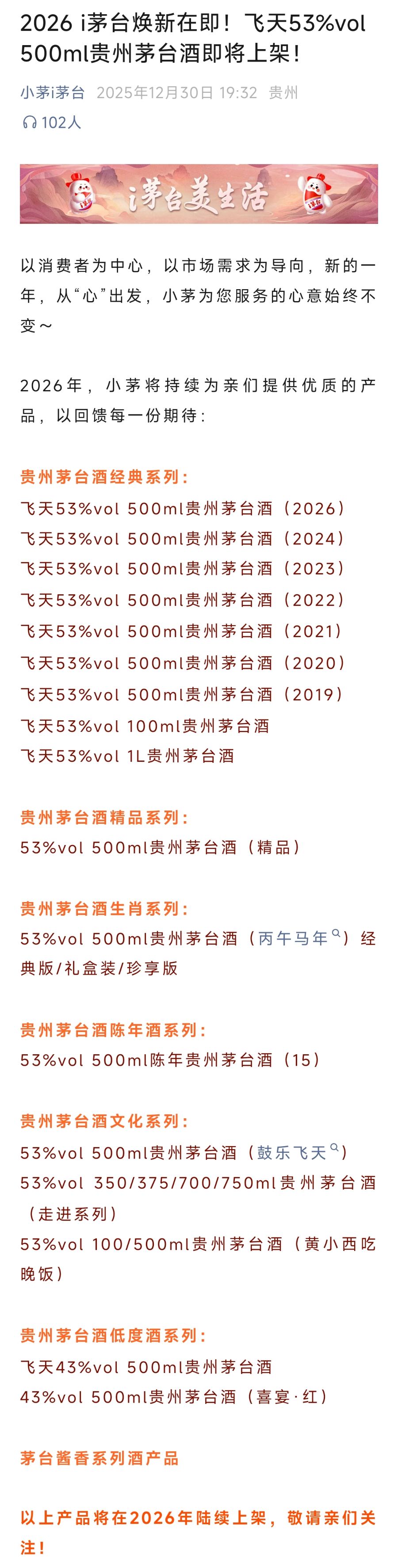 据i茅台公众号消息,2026年,i茅台将调整贵州茅台酒上架产品矩阵,主要有经典、精品、生肖、陈年、文化、低度酒等6大系列,涵盖53%vol 500ml飞天贵州茅台酒等多款茅台酒产品。
