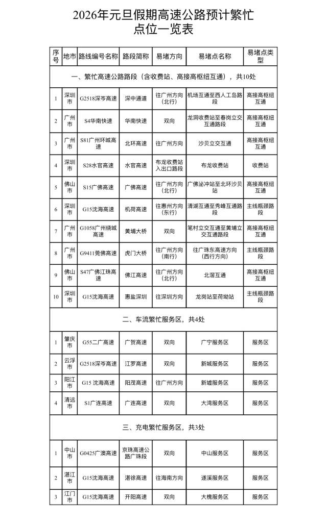 经与省公安厅交管局联合研判,2026年我省元旦假期较为拥堵的路段、收费站、车流较饱和服务区以及充电设施利用率高的服务区详见下图。2026年元旦假期,全省交通运输部门积极会同各方,提前研判,周密部署,合力保障公路运行安全畅通有序。