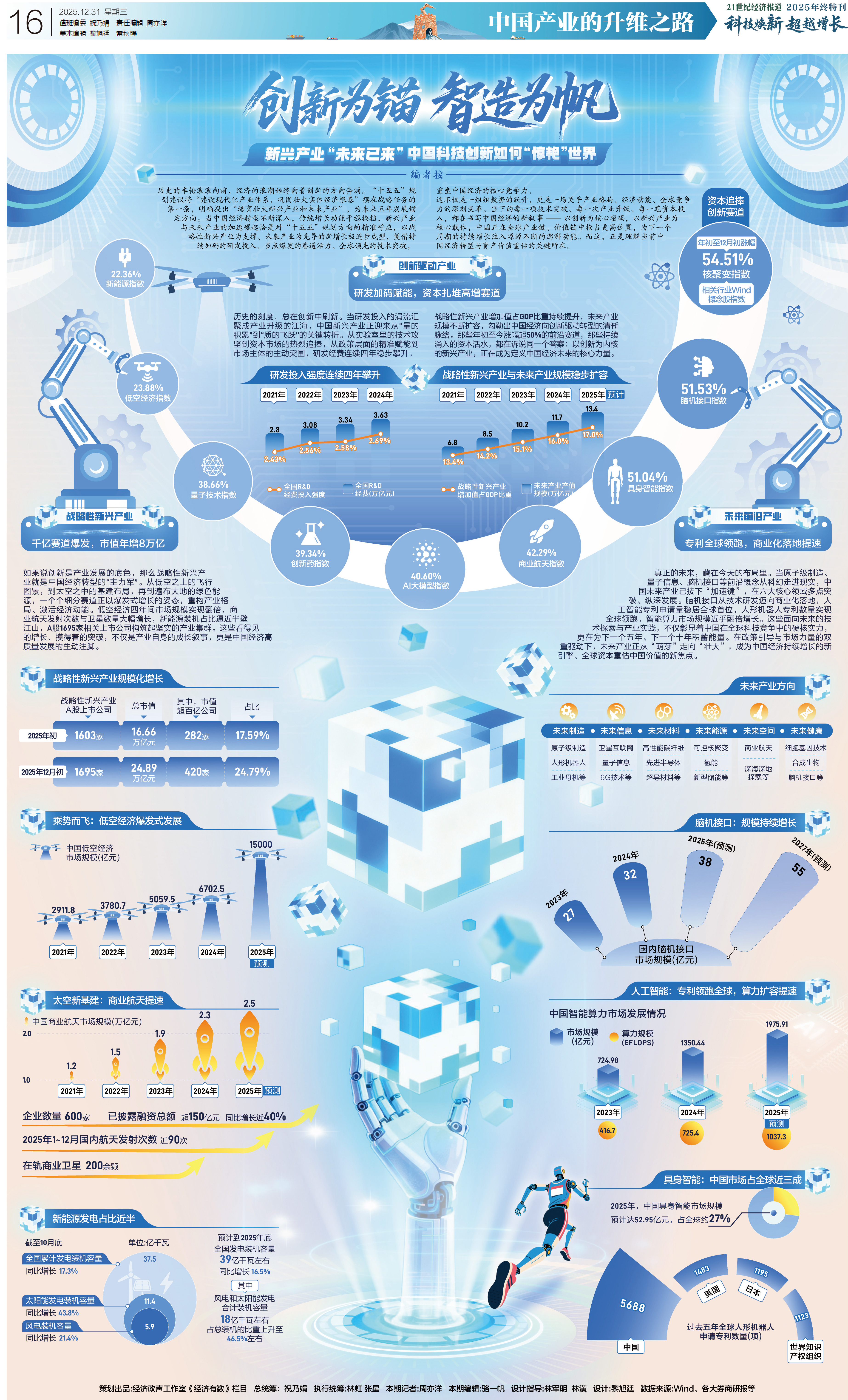 历史的车轮滚滚向前,经济的浪潮始终向着创新的方向奔涌。“十五五”规划建议将“建设现代化产业体系,巩固壮大实体经济根基”摆在战略任务的第一条,明确提出“培育壮大新兴产业和未来产业”,为未来五年发展锚定方向。当中国经济转型不断深入,传统增长动能平稳换挡,新兴产业与未来产业的加速崛起恰是对“十五五”规划方向的精准呼应,以战略性新兴产业为支撑、未来产业为先导的新增长极逐步成型,凭借持续加码的研发投入、多点爆发的赛道活力、全球领先的技术突破,重塑中国经济的核心竞争力。