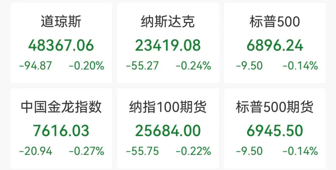 周二(12月30日),美国三大股指小幅收跌,道指跌0.2%,标普500指数跌0.14%,纳指跌0.24%,三大股指录得连续第三日下跌。