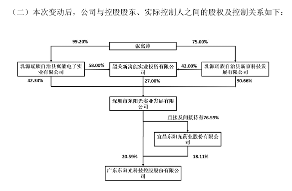 本次股权比例调整后,郭梅兰女士不再持有乳源寓能电子和乳源新京科技的股权,不再间接持有公司的股份;张寓帅先生直接持有乳源寓能电子99.20%的股权、持有乳源新京科技75.00%的股权,并通过乳源寓能电子和乳源新京科技间接持有深圳东阳光实业100%股权,从而间接持有公司1,164,828,691 股股份,占公司总股本的38.70%。东阳光实控人将由郭梅兰和张寓帅变更为张寓帅。