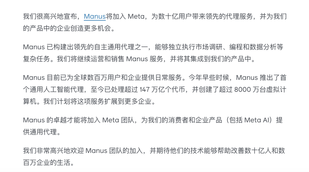 12月30日,Meta与Manus同时在官网发布公告,宣布Manus将正式加入Meta。据多家媒体报道,此次收购金额达数十亿美元。