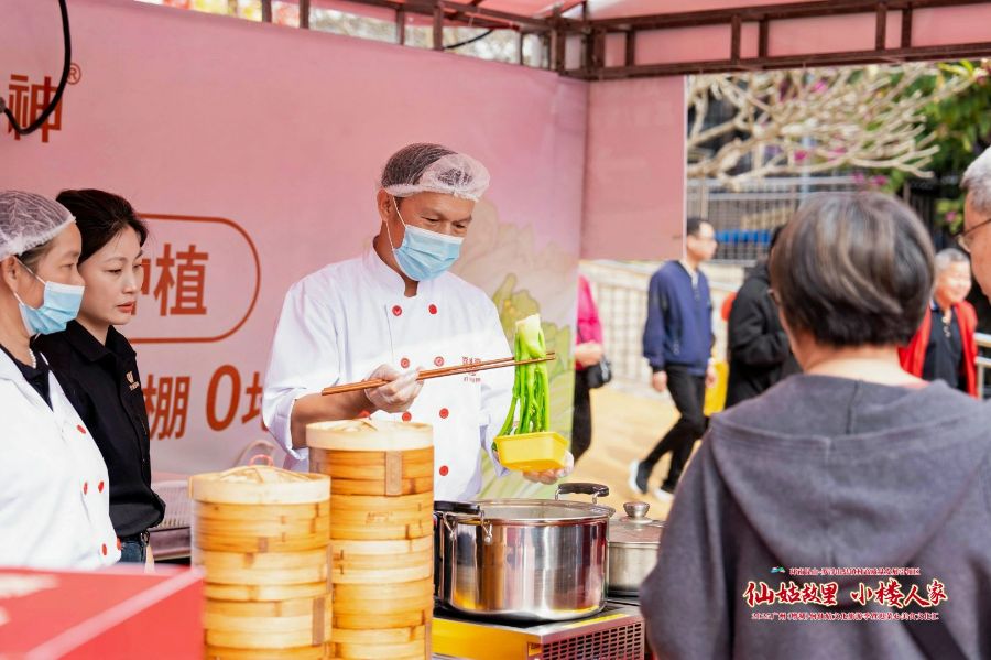 活动现场举行了合作授牌仪式。本次活动立足小楼镇“何仙姑文化发源地”与“迟菜心核心产区”的双重优势,创新探索“文化IP+特色农业”的赋能路径。美食板块以小楼迟菜心为主角,新鲜采摘的迟菜心搭配腊味蒸制、清炒等多种做法,吸引游客驻足品鉴;各类增城本土美食同步亮相,全方位展现小楼农耕饮食文化的独特魅力。
