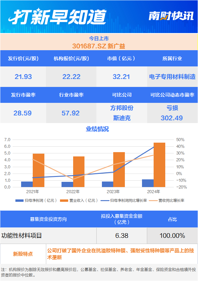 新广益是一家专注于高性能特种功能材料研发、生产及销售的高新技术企业,主要产品包括抗溢胶特种膜、强耐受性特种膜等特种功能材料;除抗溢胶特种膜、强耐受性特种膜外,公司还生产、研发并开展电子产品组件材料、改性材料、光学胶膜、新能源锂电材料、光伏胶膜等新兴业务。