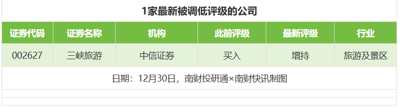评级调低方面,12月30日,券商调低上市公司评级达到1家,中信证券对三峡旅游的评级从“买入”调低至“增持”。