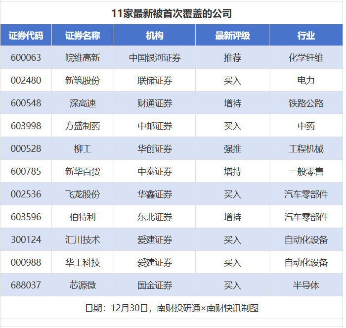 首次覆盖方面,12月30日券商共给出了11次首次覆盖,其中皖维高新获得中国银河证券给予“推荐”评级,新筑股份获得联储证券给予“买入”评级,深高速获得财通证券给予“增持”评级,方盛制药获得中邮证券给予“买入”评级,柳工获得华创证券给予“强推”评级。