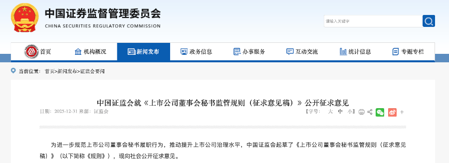 12月31日,证监会就首部《上市公司董事会秘书监管规则(征求意见稿)》(以下简称《规则》)向社会公开征求意见,标志着对上市公司“关键少数”的监管迈入精细化、强保障的新阶段。