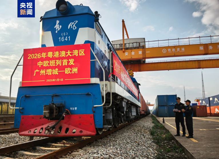 总台记者从黄埔海关获悉,1月1日上午,2026年粤港澳大湾区首列中欧班列自广州东部公铁联运枢纽(增城西站)发出。该趟班列共搭载110个标准集装箱,货值约2000万元,经霍尔果斯口岸出境,预计14天后抵达波兰马拉舍维奇。