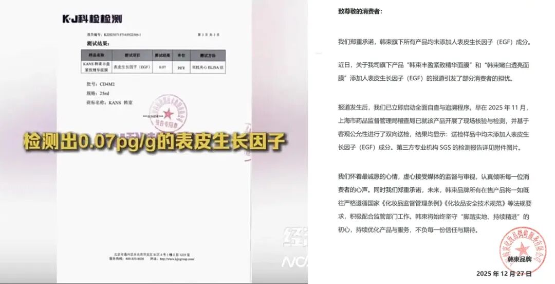 “早在2025年11月,上海市药品监督管理局就该产品开展现场核验与检测,并进行双向送检,结果均显示:送检样品,均未添加人EGF成分。”韩束表示。