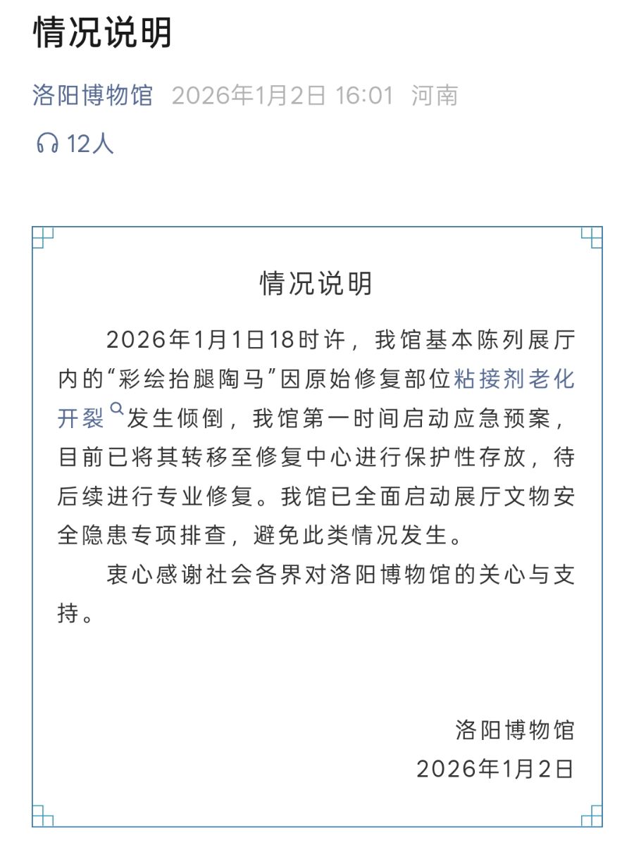 2026年1月1日18时许,我馆基本陈列展厅内的“彩绘抬腿陶马”因原始修复部位粘接剂老化开裂发生倾倒,我馆第一时间启动应急预案,目前已将其转移至修复中心进行保护性存放,待后续进行专业修复。我馆已全面启动展厅文物安全隐患专项排查,避免此类情况发生。