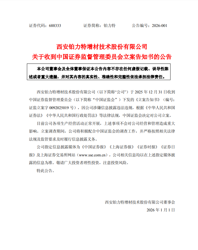 2025年最后一个交易日,千亿增材制造赛道传来监管重音。西安铂力特增材技术股份有限公司(下称“铂力特”,688333)当晚披露,公司于当日收到中国证监会《立案告知书》,因涉嫌信息披露违法违规被立案调查。这一消息让此前因商业航天概念股价飙升的铂力特站在舆论风口。记者从专业证券维权律师处获悉,目前相关索赔已正式启动,符合条件的投资者可依法核对资格、准备材料。