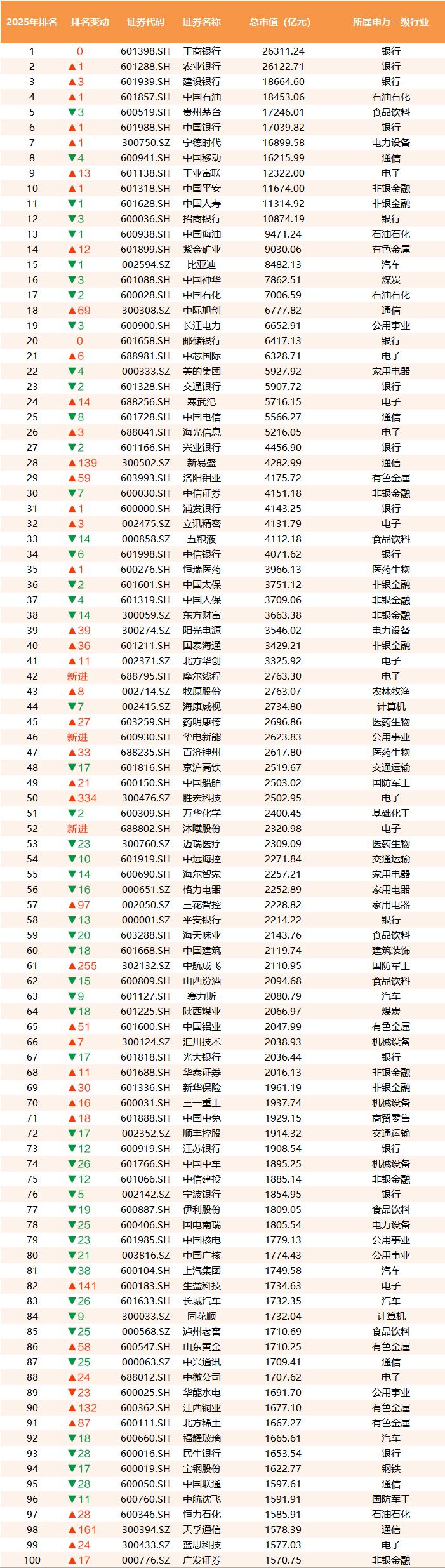 值得关注的是,2025年新上市企业表现亮眼,共有3家新进公司直接跻身市值百强。具体来看,摩尔线程(688795.SH)以2763.30亿元市值位列第42名,华电新能(600930.SH)以2623.83亿元市值排名第46名,沐曦股份(688802.SH)则以2320.98亿元市值位居第52名,三类企业均来自战略性新兴产业,印证了资本市场对科技创新领域的青睐。
