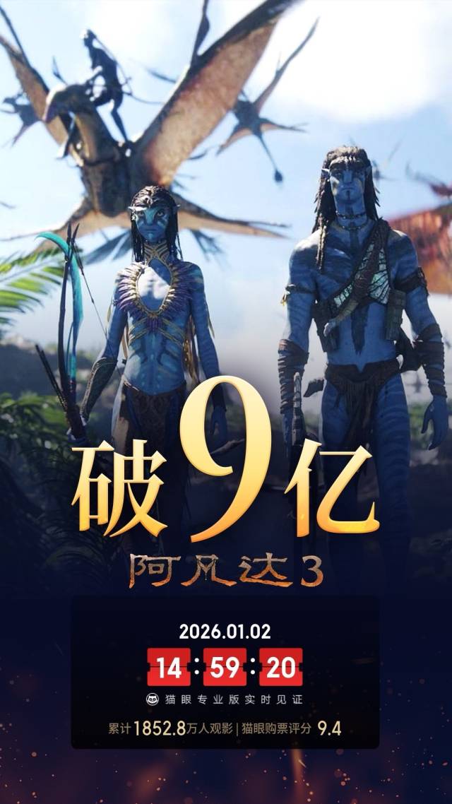 传奇导演詹姆斯·卡梅隆打造的现象级科幻IP“阿凡达”系列第三部作品《阿凡达:火与烬》,尽管口碑不如前作,但前沿的视效呈现和精良的制作水准仍令不少观众“买单”。该片在元旦档期内收获超1.8亿元票房,助力中国内地累计票房突破9亿元,13.9%的上座率也位居元旦档影片之首。