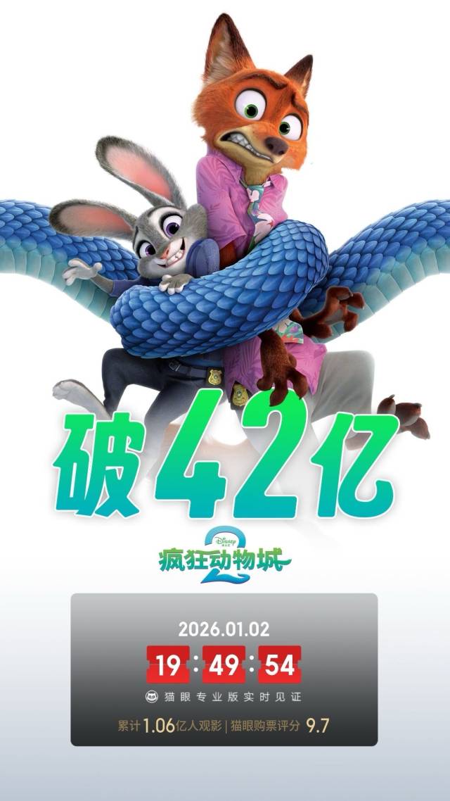 上映至今已有39天的动画电影《疯狂动物城2》凭借强大的IP基础和豆瓣8.4分的高口碑持续吸引观众入场,排片率和票房成绩均居元旦档之首。猫眼专业版数据显示,该片元旦档票房超2.1亿元,在中国内地上映以来累计票房已突破42.3亿元。