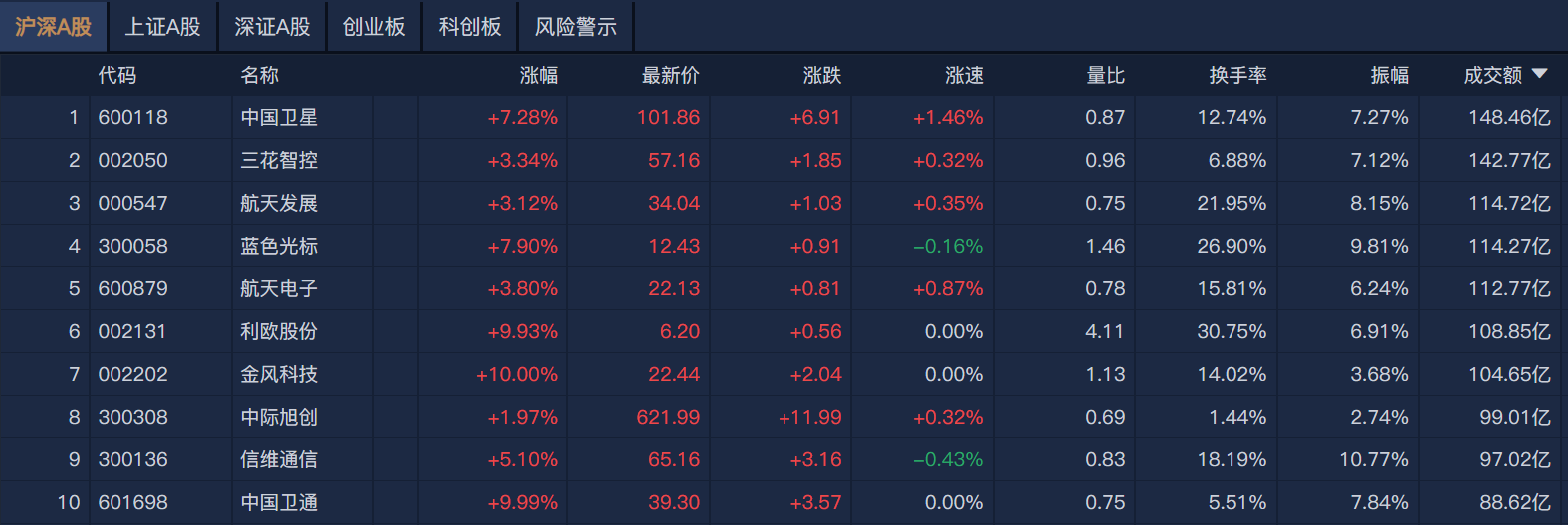 南财金融终端显示,个股方面,中国卫星半日成交额超148亿元居首,三花智控、航天发展、蓝色光标成交额靠前。