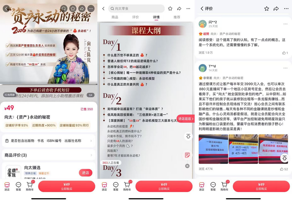 因此,明星名人做知识付费可能得更加重视后端的运营和转化。蓝鲸记者发现,向太此前还曾售卖过一门49元的课程《向太:资产永动的秘密》,主要是向太和她的资产管理团队负责人双师授课。相关评论区有消费者反馈称,课程性价比高、提高了认知;也有人表示课程注水,会向客户推销3999元的会员。社交网站上,还有网友透露向太联合资产管理人做了一个“老钱新贵俱乐部”,收费3980元。