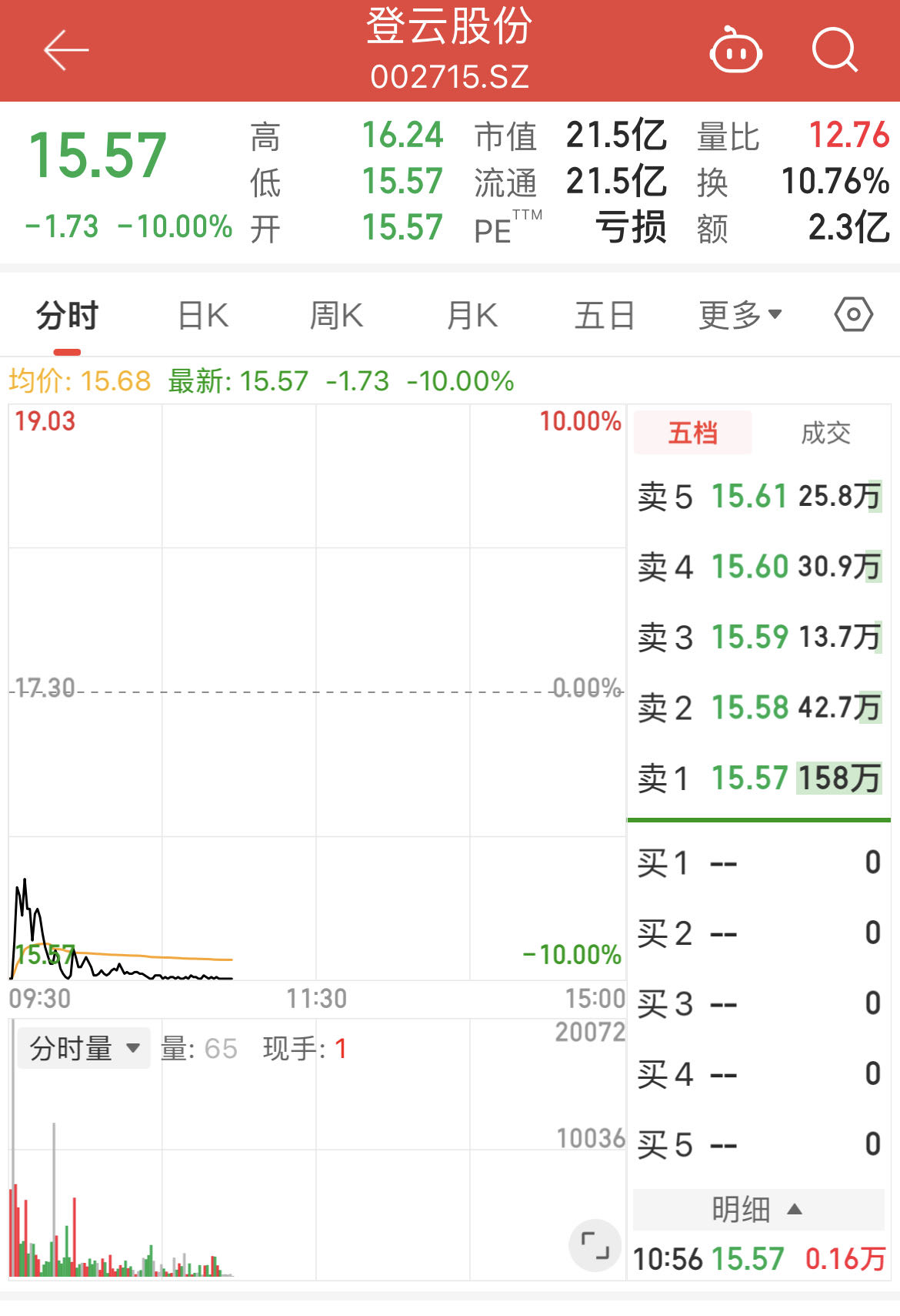 1月6日,上证指数突破前高4034.08点,刷新10年来新高,但在牛市氛围下,登云股份(002715.SZ)开盘即遭遇跌停,截至10时57分,报15.57元/股,总市值较前一交易日大幅缩水,为当前A股市场唯一非ST跌停股。