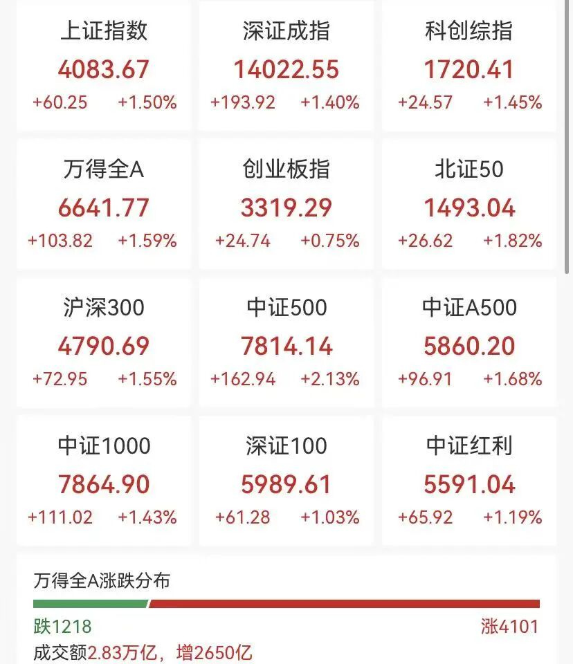 全市场逾4100股上涨,其中有143只个股涨停,连续两日超百股涨停。沪深两市成交额2.83万亿元,创逾三个月新高。