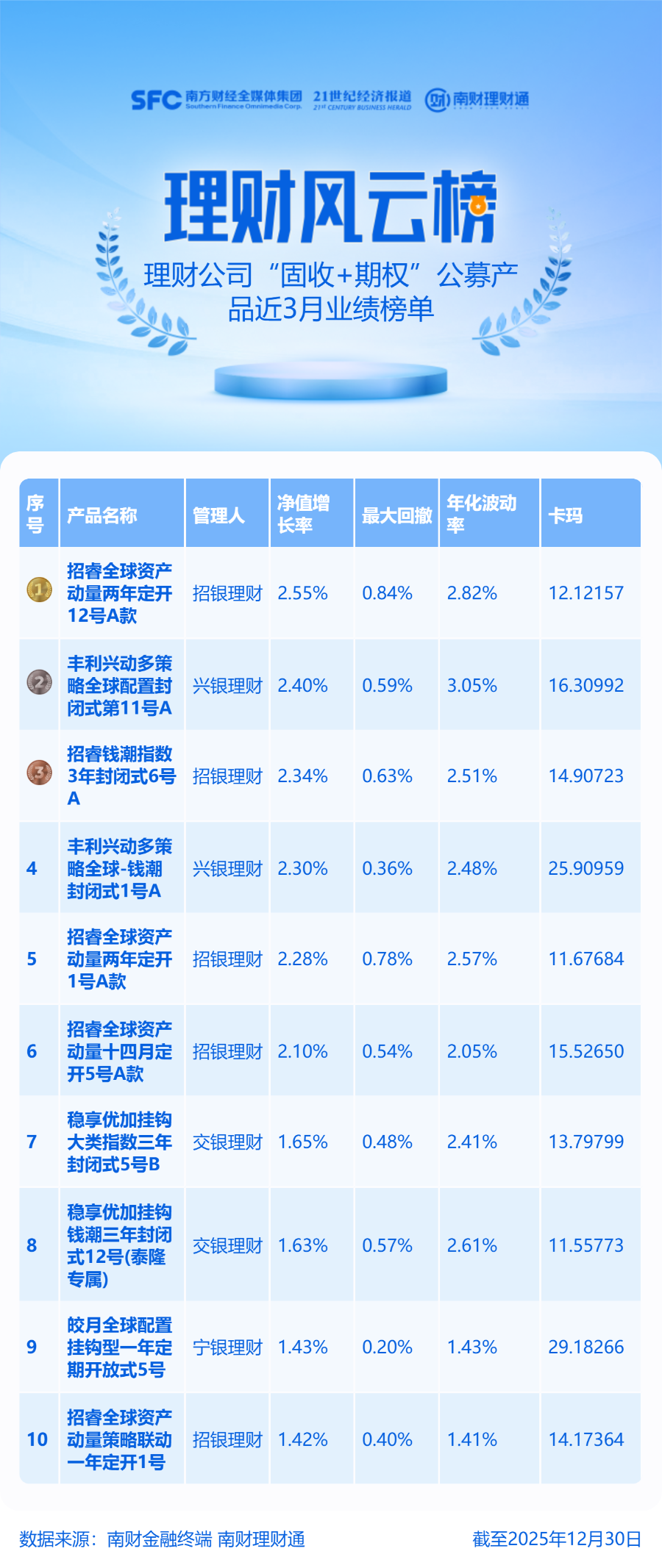 产品统计范围为理财公司发行的公募“固收+期权”理财产品,统计截止日期为2025年12月30日,统计区间为近3月。