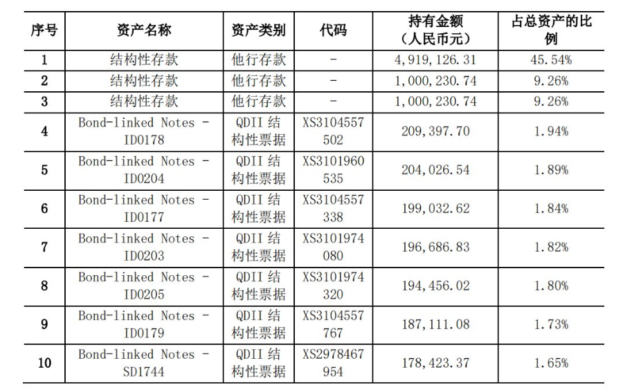 从持仓来看,2025年三季度末,该产品穿透后现金及银行存款占比约7成,QDII投资占比27.86%,拆放同业及买入返售、公募基金占比均在1%左右。前十大持仓中,前三大持仓均为结构性存款,合计占比64.06%,剩余七大持仓均为QDII结构性票据。