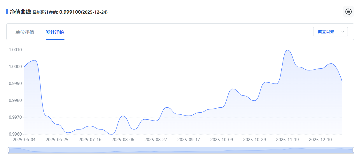 2025年三季度,该产品净值增长率为0.13%,但截至三季度末仍处于破净状态,彼时累计净值为0.9975。2025年11月19日,产品净值“收复失地”,回升至1.001,但12月24日披露的最新净值又降至0.9991。