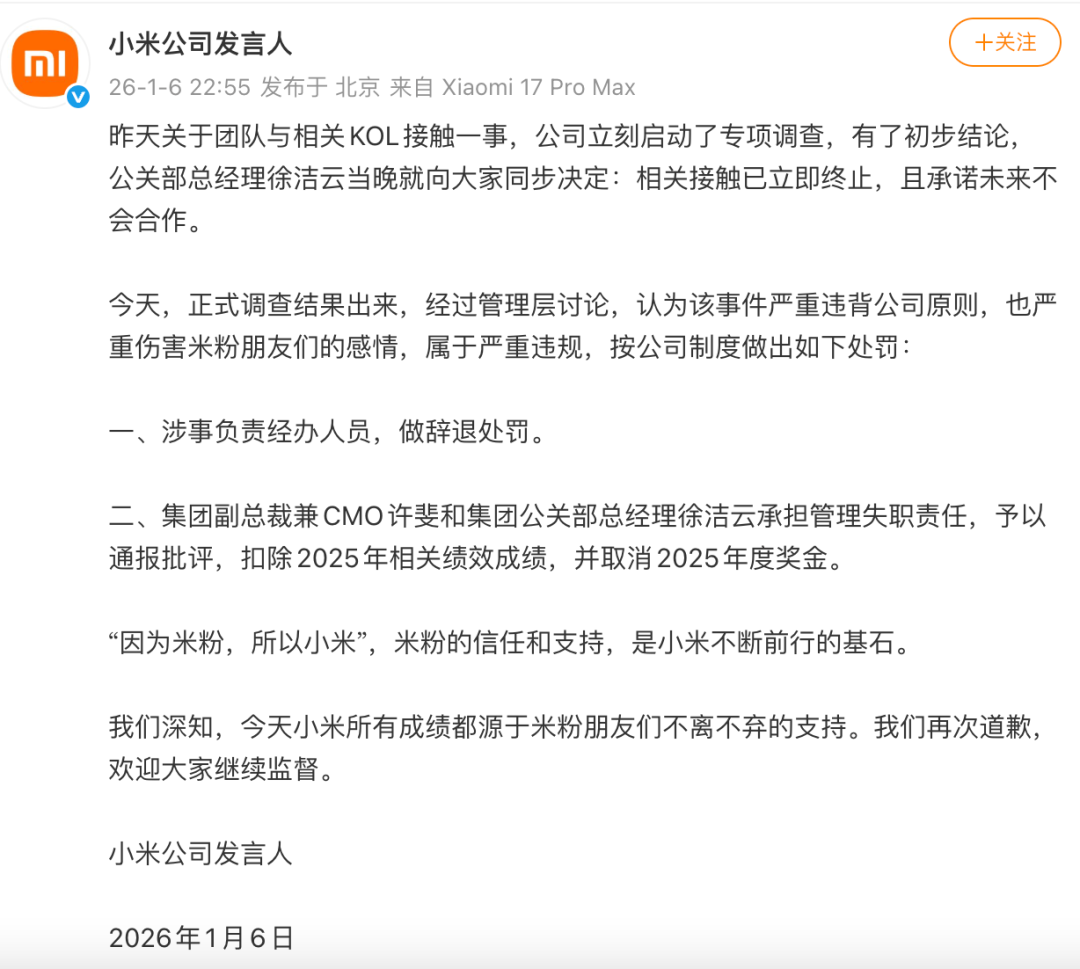 1月6日深夜,小米公司发言人官方微博发文,对“团队与相关KOL接触一事”公开道歉,并作出严肃处理:辞退涉事经办员工,集团副总裁兼CMO许斐和公关部总经理徐洁云被通报批评并取消年度奖金。