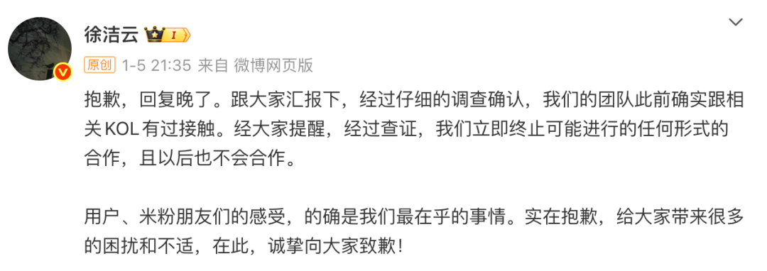 对此,1月5日晚间,小米集团董事长特别助理、战略市场部副总经理徐洁云在微博发文回应称,“经过仔细的调查确认,我们的团队此前确实跟相关KOL有过接触。经大家提醒,经过查证,我们立即终止可能进行的任何形式的合作,且以后也不会合作。”