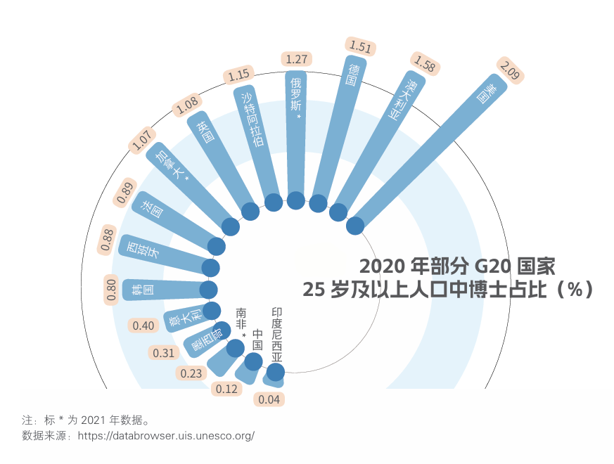答案并非如此。根据联合国教科文组织(UNESCO)数据,2020年我国25岁及以上人口中完成博士或同等学力教育的占比只有0.12%,远低于美国的2.09%、德国的1.51%、英国的1.08% 和法国的0.89%。