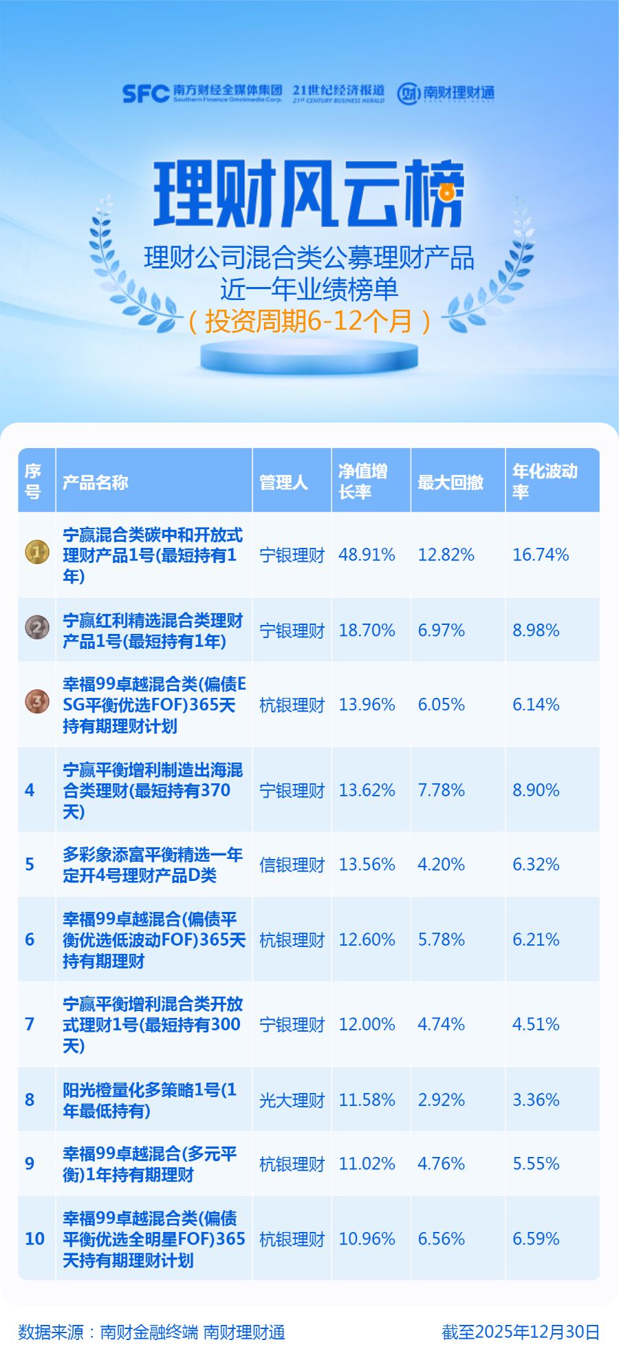 产品统计范围为理财公司6-12个月(含)期限的混合类公募理财,产品统计截止日期为2025年12月30日,统计区间为近一年。