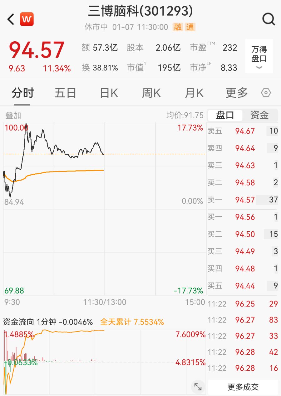 1月7日,三博脑科(301293.SZ)断板,早盘涨幅一度收窄近2%,随后强势拉升,维持震荡走势,截至午间收盘,报94.57元/股,涨11.34%,成交额为57.3亿元,总市值为195亿元。