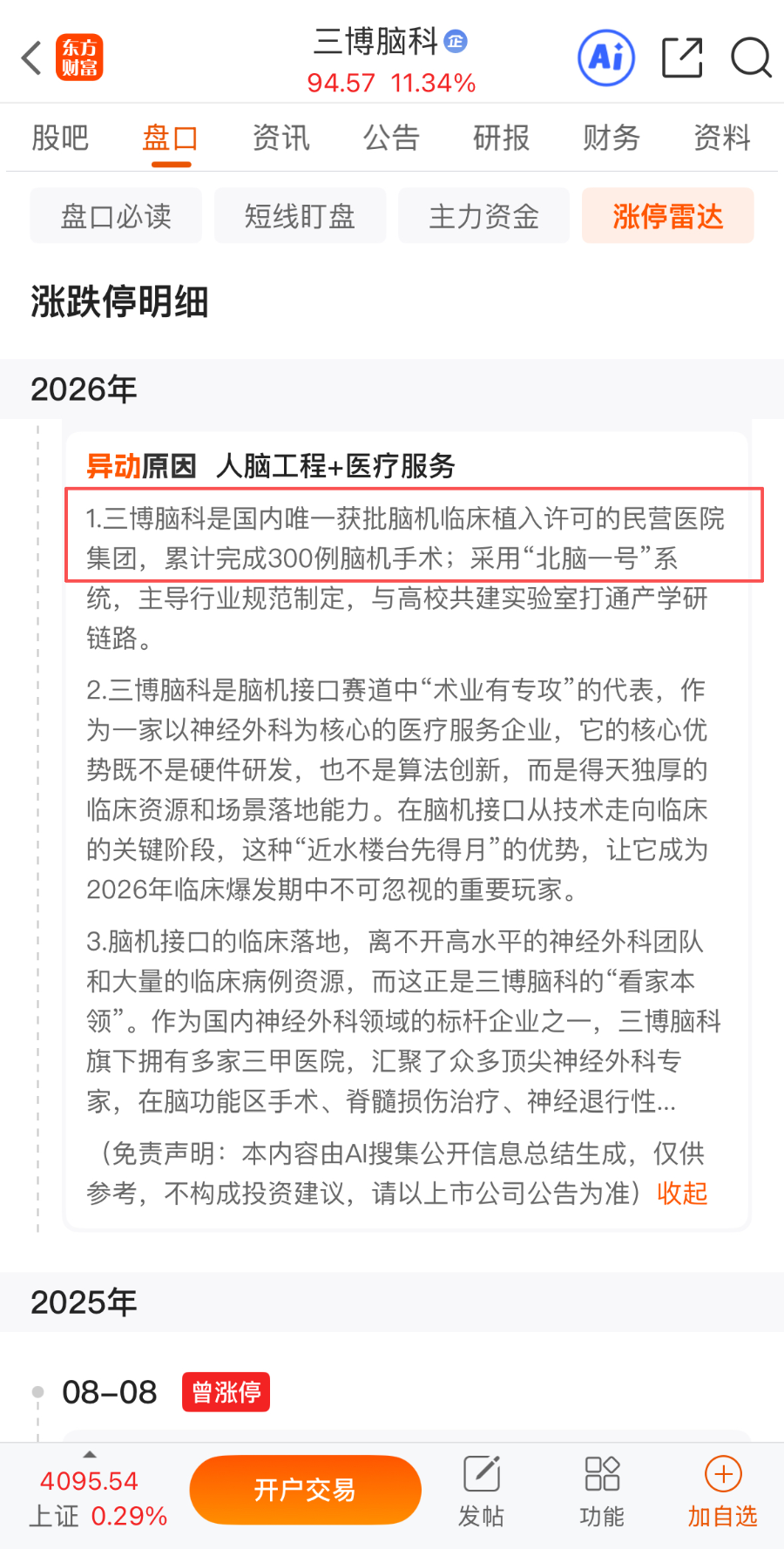 此前,受脑机接口设备量产等消息刺激,脑机接口板块掀起涨停潮。作为脑机接口概念股,三博脑科在1月5日、1月6日均收获20cm涨停。期间,21财经《辟谣财知道》注意到,有网络帖文称其为“国内唯一获批脑机接口临床植入许可的民营医院集团,累计完成300例脑机手术”,相关帖文被AI抓取到券商软件的个股涨停分析后广泛传播。