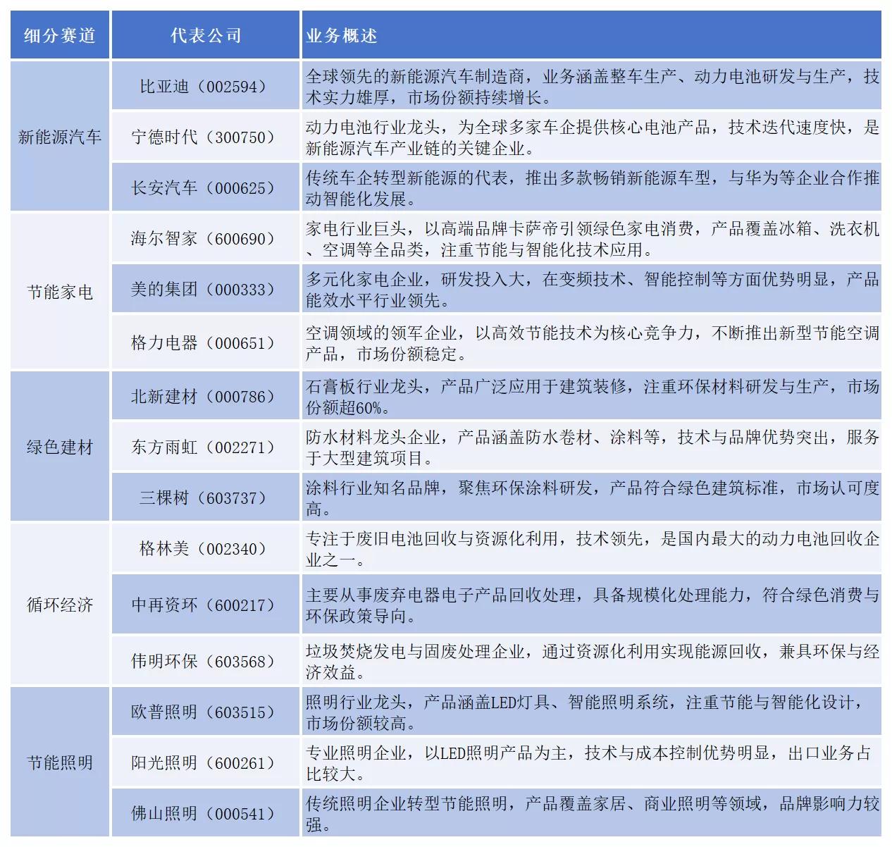 览富财经梳理了新能源汽车、节能家电、绿色建材、循环经济、节能照明等五大细分领域中的典型公司,具体如下:
