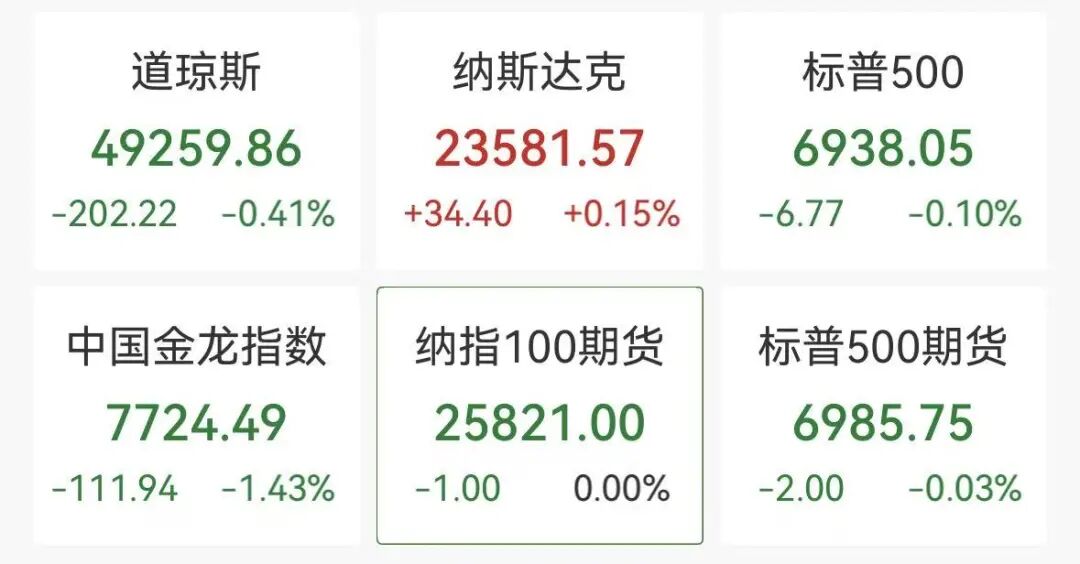 中概股多数下跌,纳斯达克中国金龙指数跌1.43%,热门个股方面,满帮集团跌超7%,禾赛科技跌近4%,网易跌超3%,京东集团、阿里巴巴跌超2%;虎牙涨超4%,万国数据涨超3%,爱奇艺涨超1%。