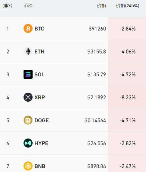 加密货币方面,主要币种集体下跌,比特币跌近3%,报91260美元/枚。过去24小时,全市场超12万人爆仓。