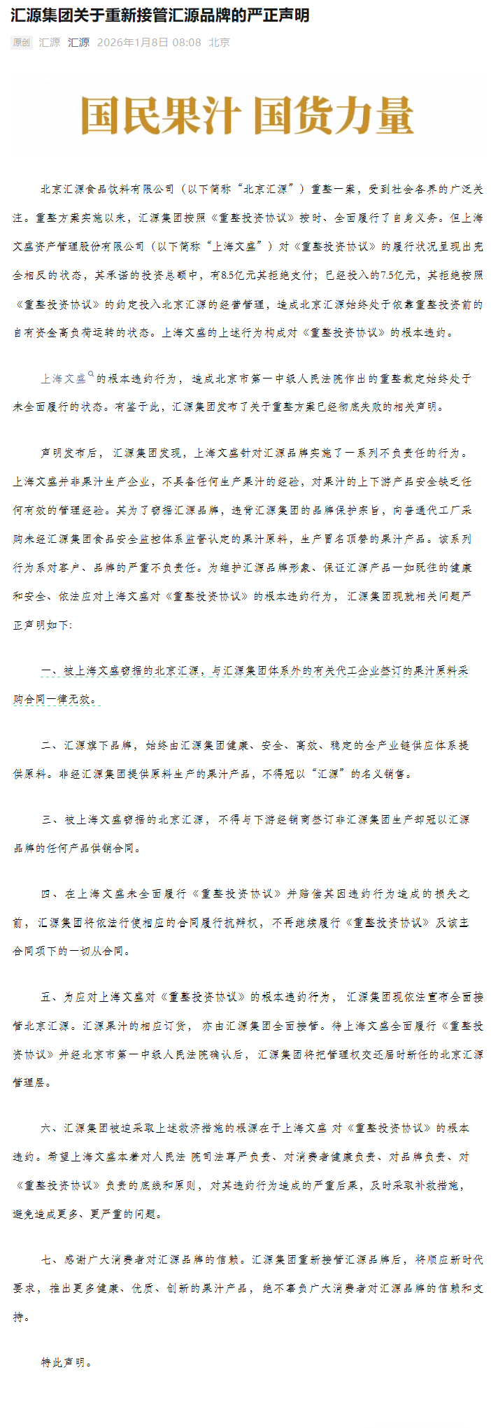 1月8日上午,“国民果汁”汇源集团再发声明,宣布全面接管北京汇源,并终止与上海文盛资产管理股份有限公司(简称“上海文盛”)及其关联方的代工合作。