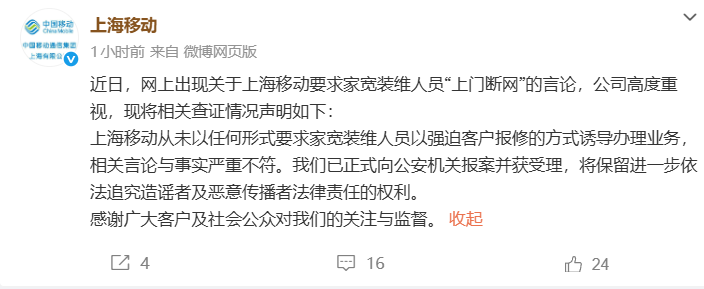 1月8日,上海移动通过官方微博发文回应称,近日,网上出现关于上海移动要求家宽装维人员“上门断网”的言论,公司高度重视。现将相关查证情况声明如下: