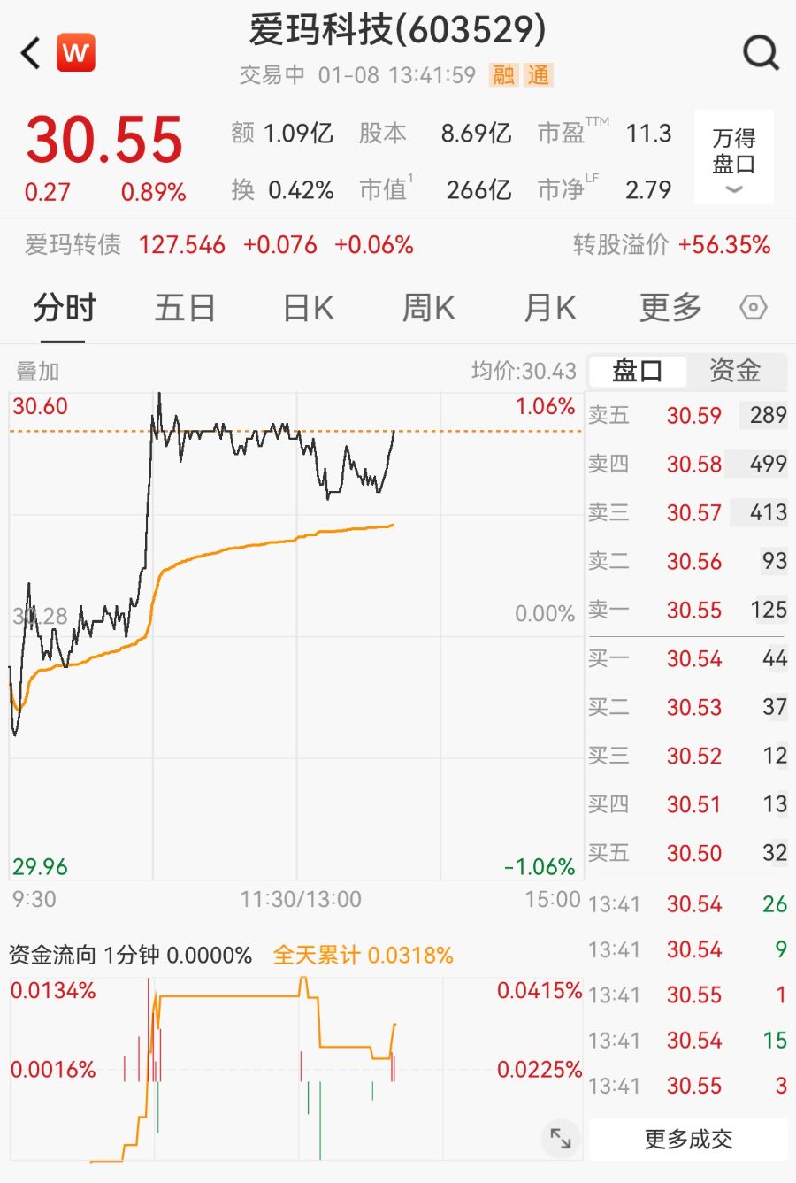 截至13:41,爱玛科技涨0.89%,报30.55元/股,总市值为266亿元。