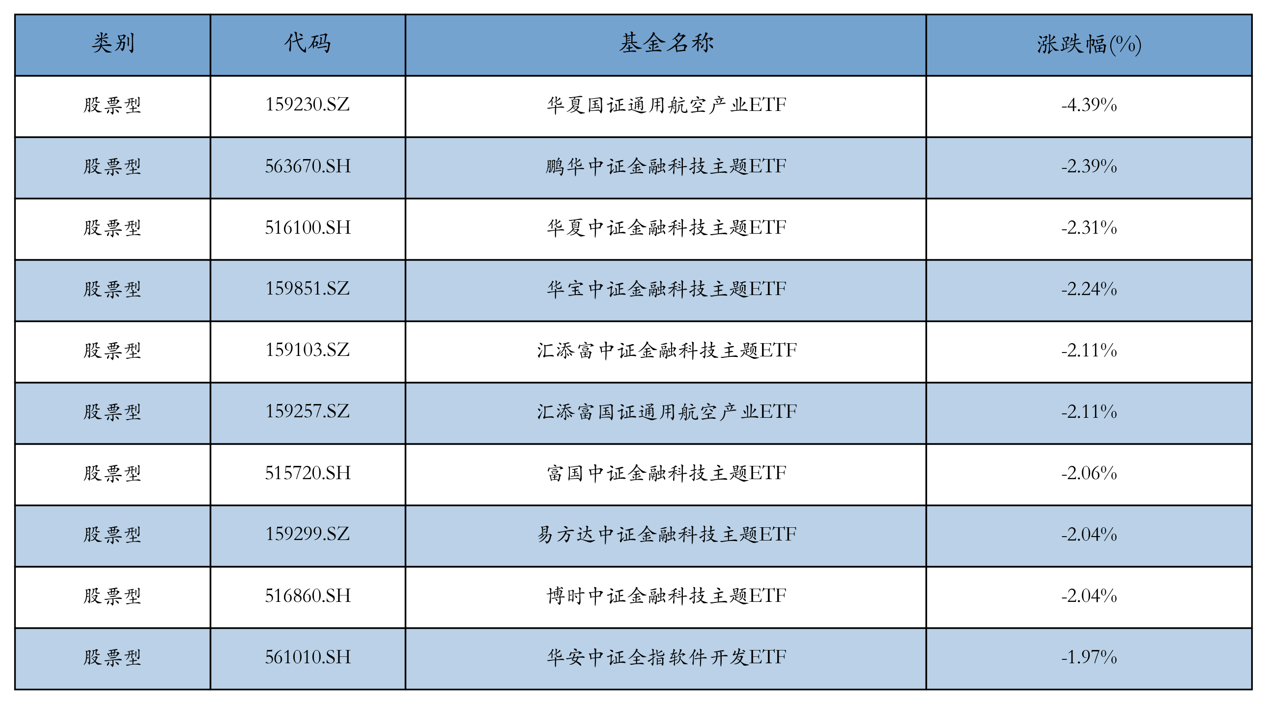 昨日股票型ETF跌幅最大的3只ETF及其收益率分别为:华夏国证通用航空产业ETF(-4.39%)、鹏华中证金融科技主题ETF(-2.39%)、华夏中证金融科技主题ETF(-2.31%)。跌幅前10详情见下表: