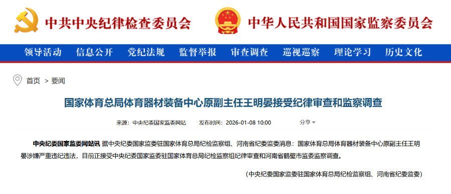 据中央纪委国家监委驻国家体育总局纪检监察组、河南省纪委监委消息:国家体育总局体育器材装备中心原副主任王明晏涉嫌严重违纪违法,目前正接受中央纪委国家监委驻国家体育总局纪检监察组纪律审查和河南省鹤壁市监委监察调查。