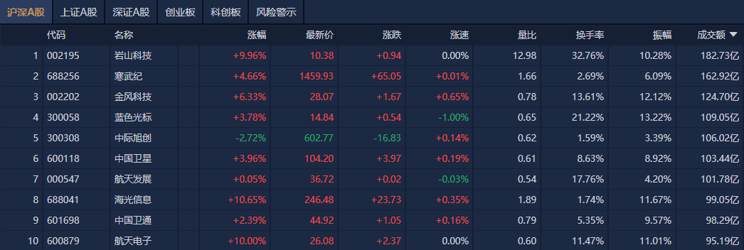 个股方面,岩山科技成交额超182亿元居首,寒武纪、金风科技、蓝色光标成交额靠前。