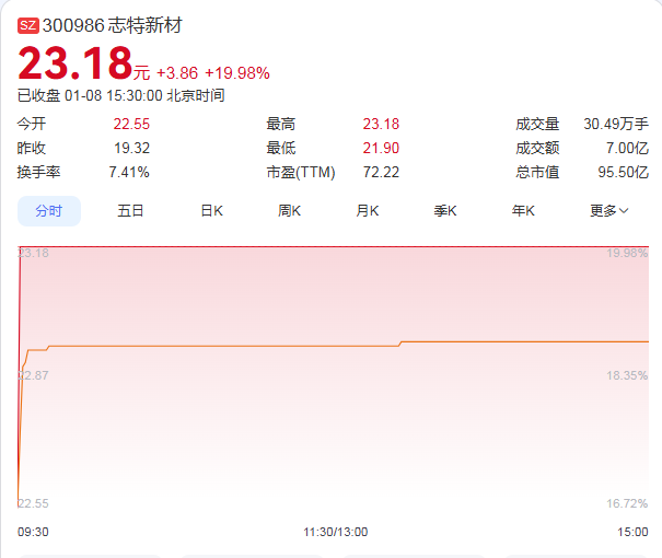 1月8日,志特新材再度强势封板,收盘价为23.18元,成交额为7.00亿元,总市值攀升至95.50亿元。据统计,自2025年12月31日以来的短短5个交易日内,志特新材股价累计涨幅已超过125%,表现非常亮眼。